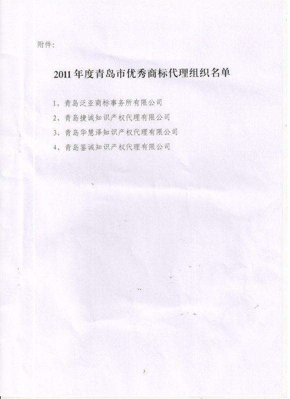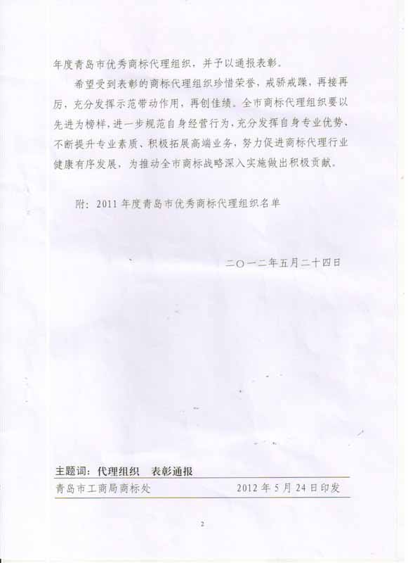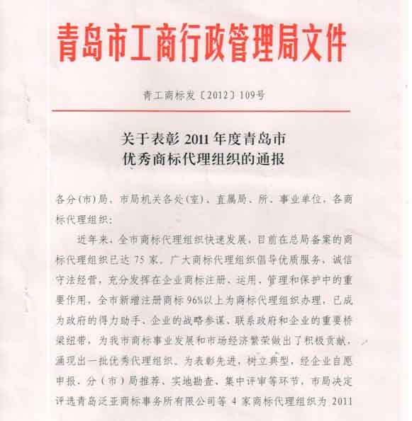 本次评选活动开展后得到了青岛市各商标代理机构高度重视和社会各界的热切关注。青岛市工商局以“公平、公正、公开”为宗旨,通过对参评代理机构的业务规模、服务质量、社会反映及所获荣誉等多个方面进行综合评定,经历初评、复评两个阶段,经过层层严格遴选,我公司最终获得了“2011年度青岛市优秀商标代理组织”的殊荣。
