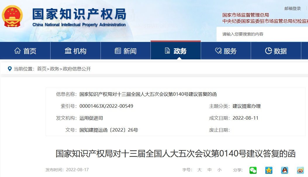 国家知识产权局对十三届全国人大五次会议第0140号建议答复的函