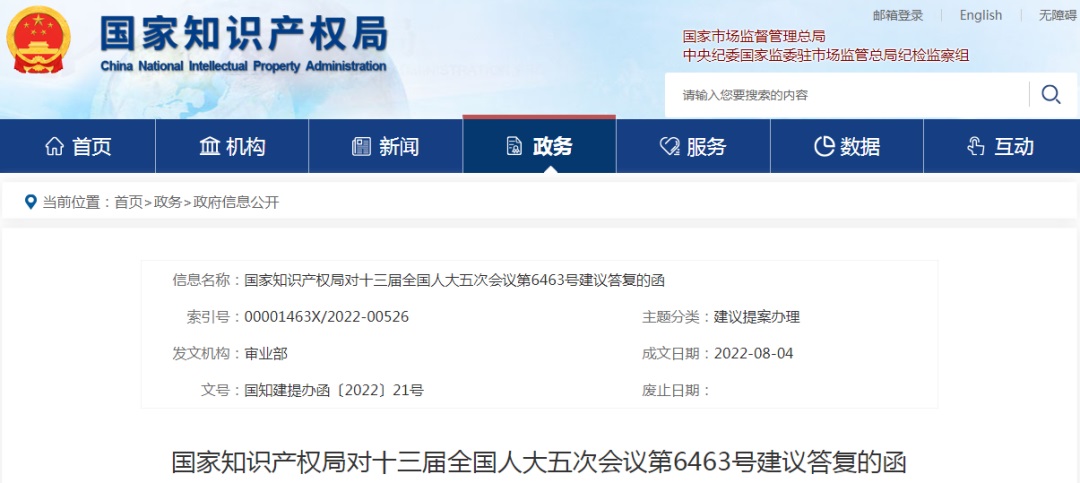 国家知识产权局对十三届全国人大五次会议第6463号建议答复的函