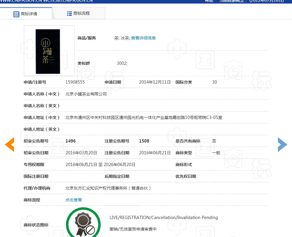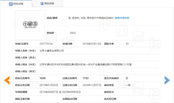 经过查询我们可以看到,“小罐茶”已经成功注册商标: