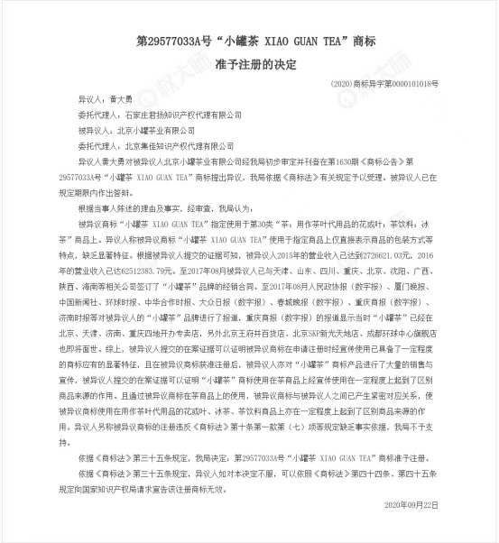 事实也正是如此,北京小罐茶业有限公司创立于2014年,创立初便尝试申请注册了以“小罐茶”为名的商标,但也确实因为注册产品类别缺乏显著性而被驳回,然后便开始了无休止的驳回复审,期间北京小罐茶业有限公司也是确实将产品放在第一位,用心做好茶,并且也是收获一致好评和媒体宣传报道,一直持续到2018年重新提交注册并且再次进入驳回复审阶段,通过提供公司经营创收产生的影响力,与多地多家公司签订合作合同,具有一定程度的大众辨识度,加上媒体报道等相关证据,终于在2020年九月份,商标局正式准予注册!