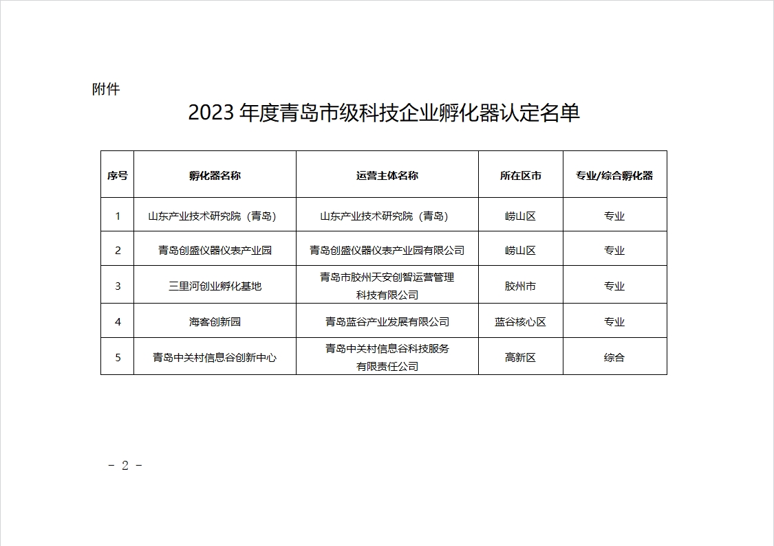 根据《青岛市科技企业孵化器管理办法》(青科规〔2023〕1号),经申报受理、区市推荐、专家评审、现场核查等环节,现认定山东产业技术研究院(青岛)等5家单位(名单见附件)为青岛市市级科技企业孵化器。