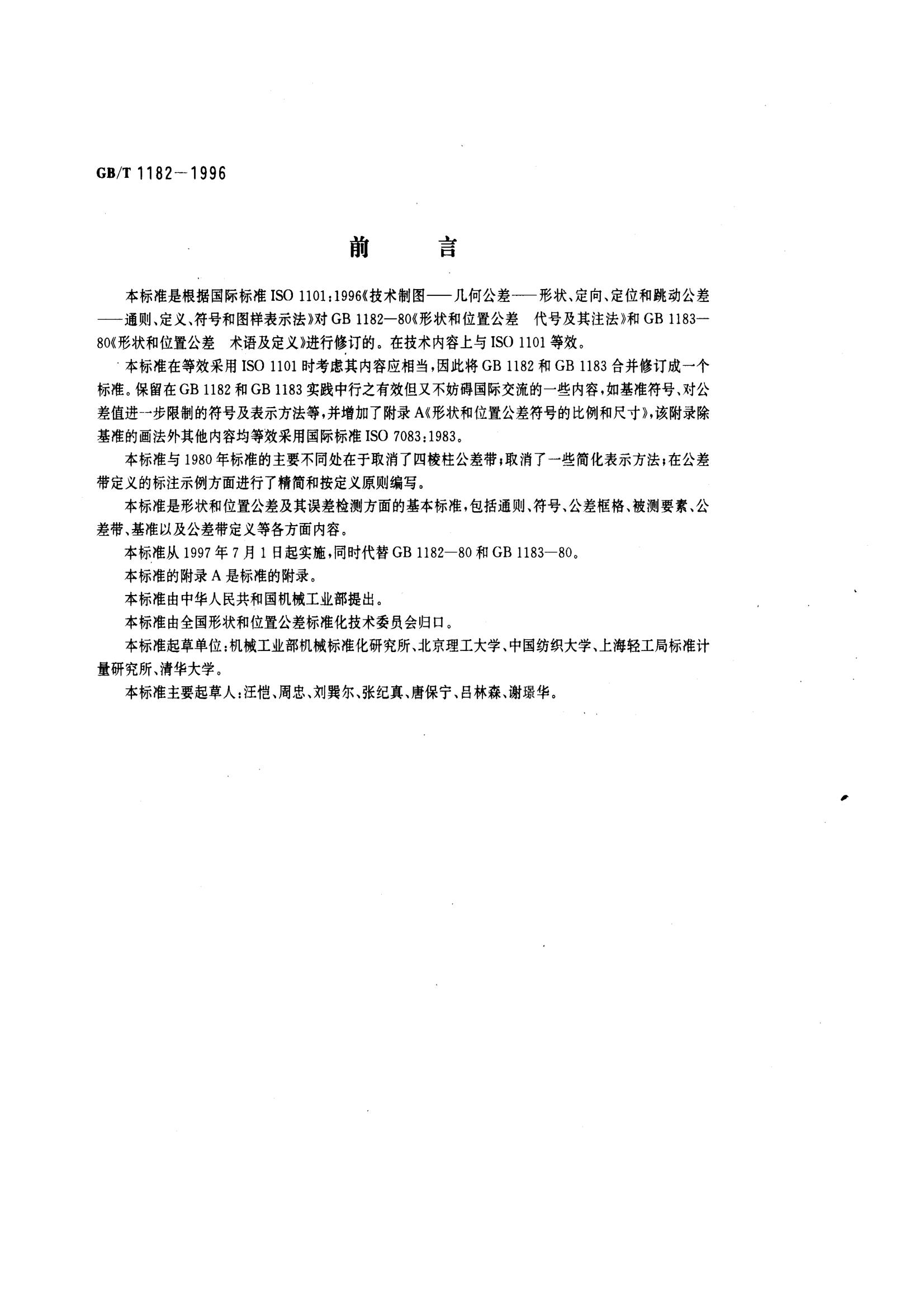 • 本標準是根據國際標準ISO 1101:1996《技術制圖一幾何公差一- 形狀、 定向、定位和跳動公差通則、定義、符號和圖樣表示法》對GB 1182- - -80《形狀和位置公差代號及其注法》和GB 1183-...